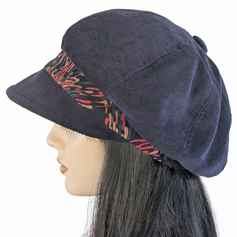 $65.00 CADNew Baggy Newsboy Fashion Cap in dark navy with navy fun peacock print inspired band, relaxed fit in corduroy