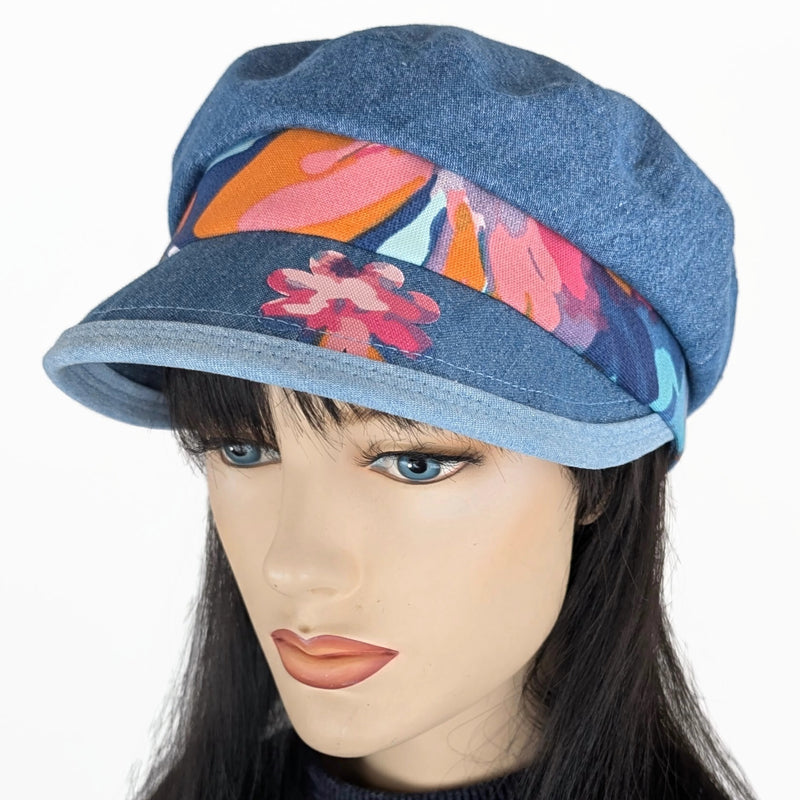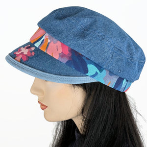 One size fits many cap is designed with a section of elastic enclosed in the band at the back for comfortable fit. This beauty has a broad wide visor with finished edge in contrasting lighter denim picking up the light blue in the coordinating print. Features washed blue denim and a small flower applique on the visor brim. Like most of our caps, a one of a kind creation!