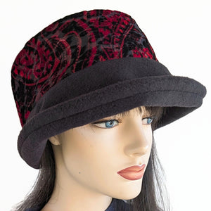 This one is handmade from high quality cosy warm black polar fleece that is water and pill resistant. Band is made from a black and red velvet burnout fabric with a very plush feel. Fully lined with hair saving Kasha Cloth (lovely cotton rayon blend). Tuck up earflaps are built into the lining and provide hands free enjoyment of the hat when worn down over the ears and across the back of the neck, in just about all windy weather.