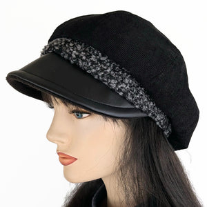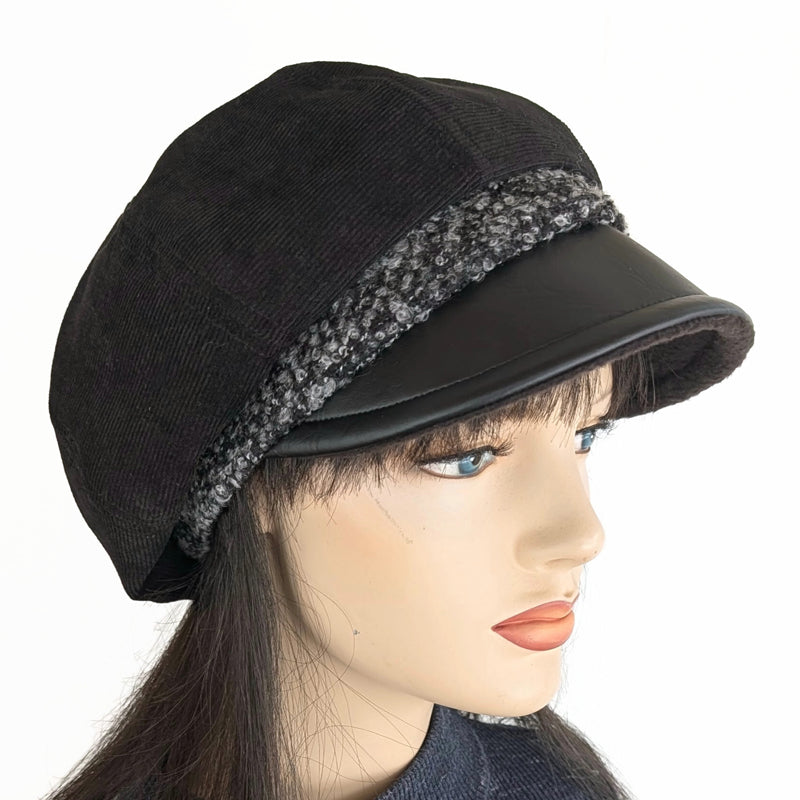 Our comfy baggy fit Poorboy Fashion Cap has a baggier top designed for the cooler weather ahead in cotton and poly cotton blend black corduroy and trimmed with woolen boucle band and vinyl visor in black. Eight panel top has a baggy beret flare with the bonus of a protective broad visor brim. Band adds a splash of black, cream and grey in woolen boucle fabric. Studio made button in vinyl at the top adds an extra touch of style to the cap.