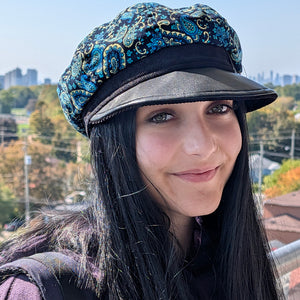 Our comfy Poorboy Fashion Cap is designed for a super comfy fit and for the cooler weather ahead in cotton and poly cotton blend corduroy and trimmed with super soft weather resistant vegan leather in black. Eight panel top has a touch of beret with the bonus of a protective broad visor brim. Top of cap is made from cotton cord in blues and yellow paisley on a black background. Studio made buttons in the two fabrics add an extra touch of style to the cap.
