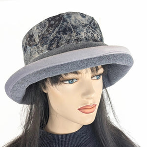 Band features an abstract design in beautiful hues of silver, taupes, earthy greens and more while large brim is finished with a stabilizing plastic millinery wire which is covered with silver gray velvet. Hat brim and top is charcoal and both are premium pill and weather resistant polar fleece.