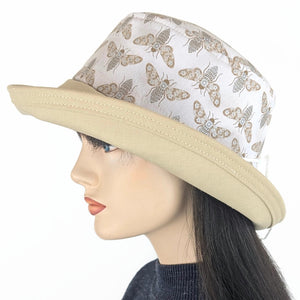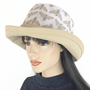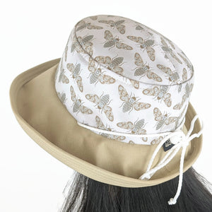 Sunblocker UV summer hat sun hat with large wide brim featuring bugs in earth tones with silver metallic highlights and adjustable fit. This is a classic lovely sun hat. Sun Protection with Style!