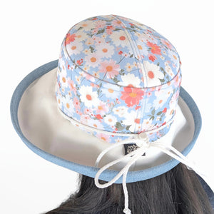 Sunblocker UV summer hat sun hat with large wide brim featuring daisies and wild flowers in light blue and pastels and adjustable fit. This is a classic lovely sun hat.  Sun Protection with Style!