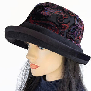 Stylish wide brimmed winter fashion hat in black with a velvet burnout band in black. purple and red paisley and black velvet edge. Fully lined with thick premium cotton blend kasha lining with some elastic in the lining at the back of the hat for comfortable fit. Snow and Winter protection with Style!