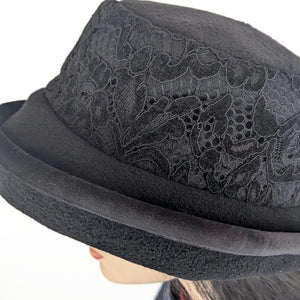 Band features a plush design in black lace overlay with velvet in the design, while large brim is finished with a stabilizing plastic millinery wire which is covered with black velvet. Hat brim and top are black premium pill and weather resistant polar fleece.