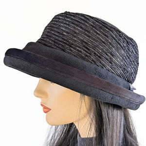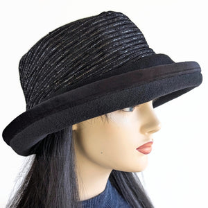 Band features a sparkly velvet linear design with some texture. The wide brim finished with a stabilizing plastic millinery wire which is covered with black velvet. Hat brim and top are black premium pill and weather resistant polar fleece.