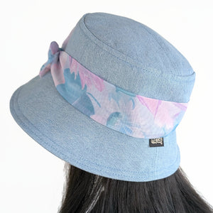 Sun Hat Perfect Bucket Hat, bleached denim with scarf and pin trim, with deep bucket brim