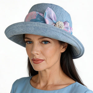 This hat has built in pastel scarf.   The bow knot is finished with a small sparkly flower brooch.  The body of the hat is made from premium bleached cotton denim.  Hat is fully lined with blue broadcloth and there is a section at the back on the hat, in the lining, with elastic for comfortable fit. This hat includes the flower pin which you can easily replace with brooches from your own collection.  This hat loves bling!