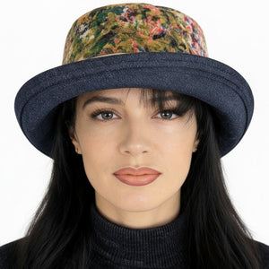 Sunblocker UV summer sun hat with large wide brim featuring dreamy abstract floral print in darker colors on navy background and adjustable fit.