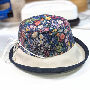 Sunblocker UV summer sun hat with large wide brim featuring beautiful floral print in bright colors on navy background and adjustable fit.